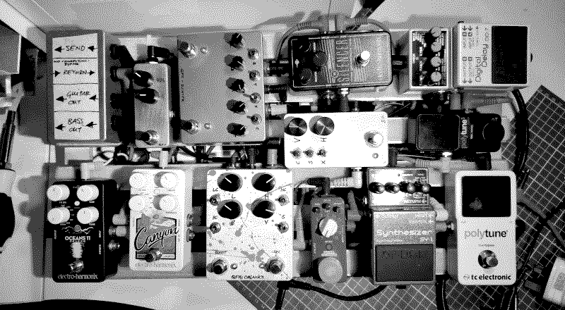 I have been using the same general board for some time. I have went through several iterations of this in Third Island, generally using the same pedals and approach outside of the distortions. Always have a reverb, delay, low octave, and tuner. To be fair, in most setups you should be able to get away with this for a minimum if you've access to a good amp at a gig, and could lose either the delay or reverb (to taste) but given the style of music and approach for myself it was always going to be expanded on.